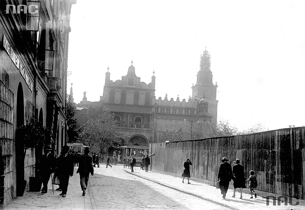 Byłem zaskoczony, gdy zobaczyłem to archiwalne zdjęcie, bo myślałem, że wszystkie kamienice przy Rynku Głównym mają raczej więcej niż 80 lat. Moja intuicja nie była całkiem błędna, ponieważ w miejscu, w którym na archiwalnym zdjęciu jest pustka znajdowały się wcześniej aż trzy kamienice, które wyburzono w 1914 roku.